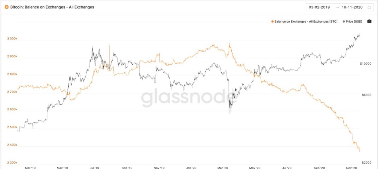 Yesterday, I mentioned the shock and awe people are experiencing around the price gains. I said it was because most people don’t understand the answer to the question “what is money?”. Here’s some data to back that up. The orange line above is the amount of BTC held on exchanges — the websites where people swap their fiat for BTC. The black line is the price of Bitcoin. Just look from May 2020: Bitcoin has been allergic to exchanges. A shortage of Bitcoin with demand increase = Number Go Up. Until this trend reverses, we can expect more of the same.