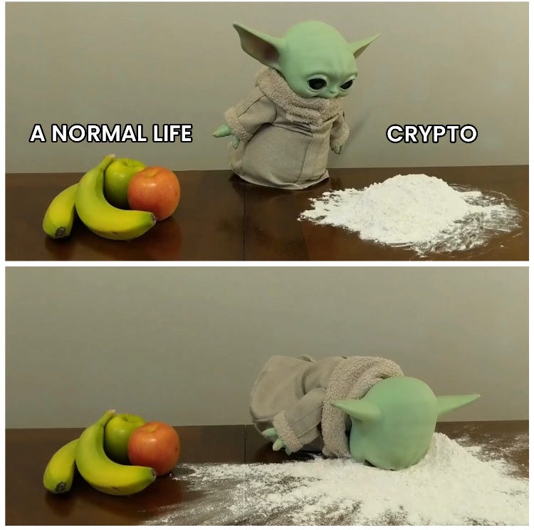 From my obscure digital corner of the web, this one made me laugh out loud. Baby Yoda, brought to adorable fame through the Mandalorian Disney series, face planting in a pile of coke is about as irreverent an image as it gets to describe life in crypto. And not wrong — the potential of this technology gets more than a few hyperactively excited.