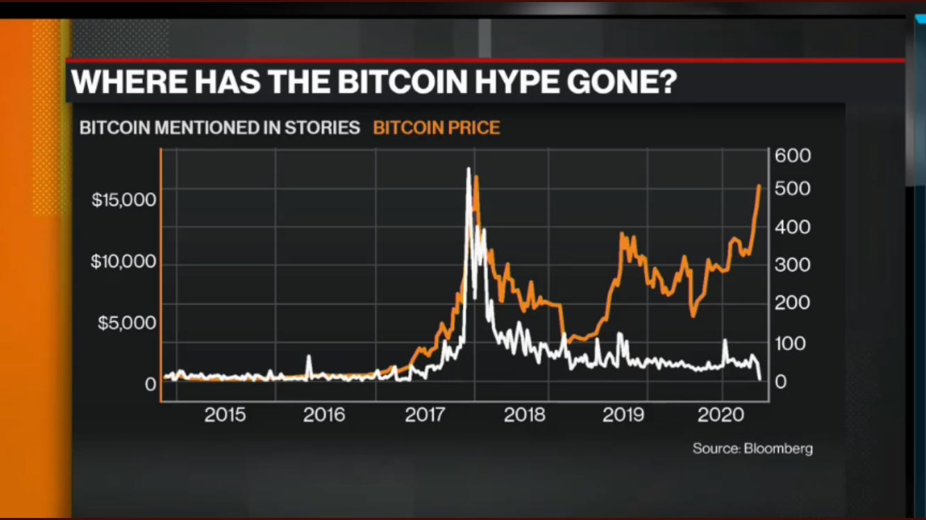 It’s the question du jour. The white line is the number of times Bitcoin was mentioned in the media while the orange line is the Bitcoin price. The two lines were one and the same the last go at $20k, but this time… crickets from the media. Why is that?